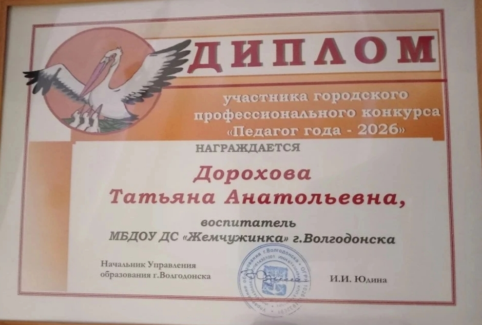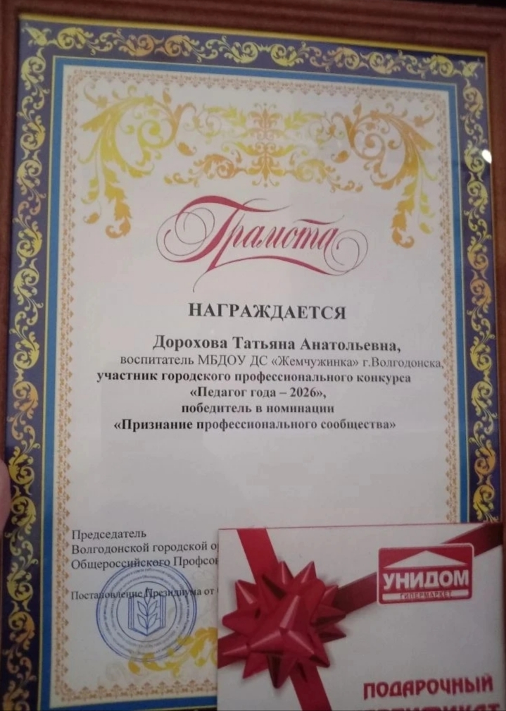 Завершился 36-й городской профессиональный конкурс "Педагог года - 2026". Наш детский сад достойно представляла Татьяна Анатольевна Дорохова в номинации "Воспитатель года". Татьяна Анатольевна работает в саду с 2017 года, имеет первую квалификационную категорию, является членом Партии "Единая Россия". Председатель Волгодонской городской организации Общероссийского профсоюза образования Елена Писковацкая отметила профессионализм нашего участника Почетной грамотой и подарочным сертификатом.
